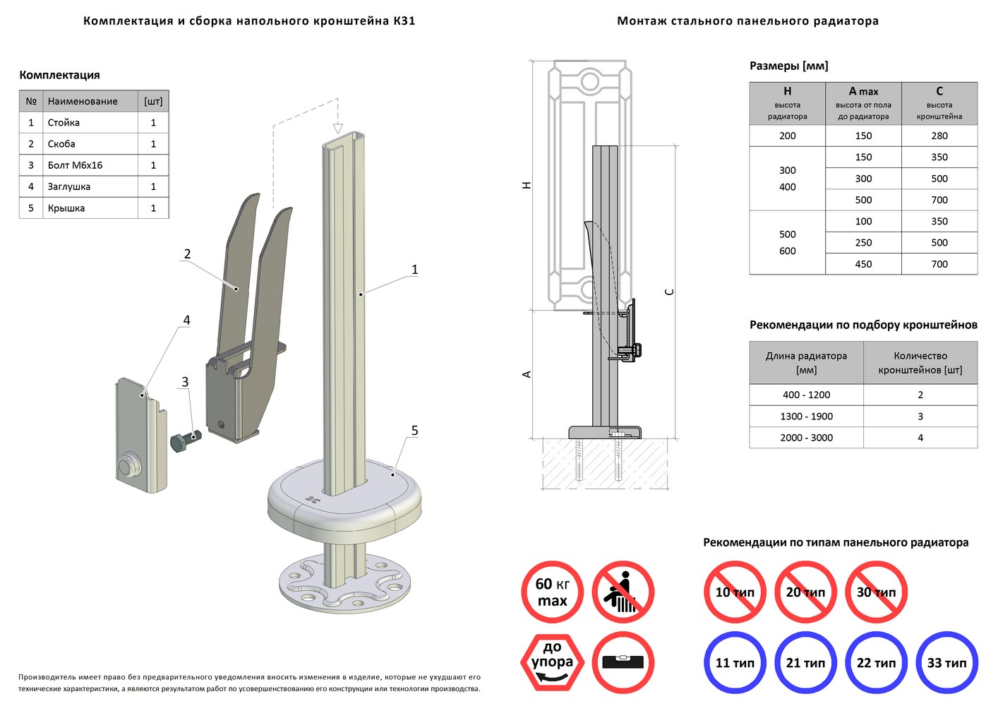 Напольный кронштейн К31.35 предназначен для крепления стальных панельных радиаторов LEMAX Premium с боковым и нижним подключением высотой 200-600 мм типов 11С (VC), 21С (VC), 22С (VC), 33С(VC).